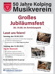 Der Kolping Musikverein veranstaltet zusammen mit der Pfarrgemeinde St. Martin Bad Lippspringe das traditionelle vorweihnachtliche Turmblasen. Am Sonntag, den 22.12.24, werden wieder weihnachtliche Lieder aus den Höhen der St. Martinskirche ab 19:00 Uhr erklingen. Das Kolping Jugendorchester wird zudem vor dem Eingang der Kirche Lieder zum Mitsingen präsentieren. Alle Badestädter und Gäste der Badestadt sind …