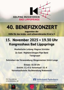 Musikalische Tradition und Tanz für den guten Zweck Seit nun 39 Jahren findet immer im November das große Benefizkonzert des Kolping Musikvereins Bad Lippspringe im schönen Kongresshaus der Badestadt statt. In diesem Jahr präsentiert sich der Musikverein mit seinem Jugendorchester am Samstag, den 16. November. Den Abend bereichert der Musikzug des Bürgerschützenvereins Schloss Neuhaus mit …